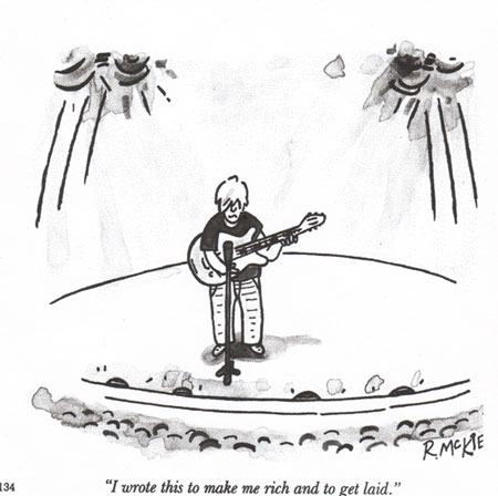 Out of all the fans I’ve talked to, all the CD inserts I’ve read, and all the video and TV specials I’ve watched, no one has ever pointed out what seems to me to be the biggest fallacy of the “The Industry”, and that is this; if these producers, managers, reps, and executives know so much about music then why aren’t THEY the ones writing the songs. With software and the internet at my disposal, I think I’ll lets the fans decide for themselves. Hey, don’t get me wrong I would love to get signed, and I’m all about money as is every other human being, but not at the expense of the song. So if you’ve read this far and are thinking of signing me, know this:
